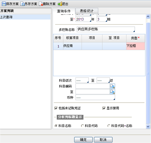 - 科目编码:提供编码和名称的模糊匹配,也可以点参照按钮参照选择,此处科目参照中只显示该多栏账设置中分析的科目。