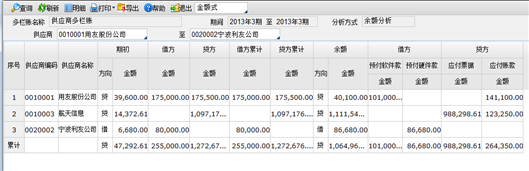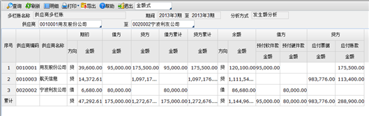 【第二步】输入查询条件后,点击〖确定〗按钮进入项目综合多栏账查询页面,当多栏账分析方式设置为发生额分析时,如下图所示,表体中借方下的科目在多栏账中设置的分析方向为借方,显示的数据为其借方发生额,贷方下的科目在多栏账中设置的分析方向为贷方,显示的数据为其贷方发生额。