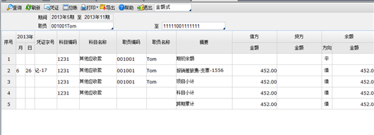 【第二步】输入查询条件后,点击〖确定〗按钮进入辅助项目明细账查询页面,如下图所示:
