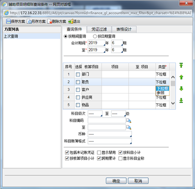 - 类型:设置查询结果页面核算项目选择方式的类型,可选项有:下拉、参照。