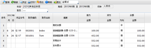 若查询科目存在一张凭证上有多行科目与辅助项都相同的凭证,当勾选“按凭证汇总”,不勾选“按摘要汇总”时,查询结果相同的辅助项汇总显示一行,如下图: