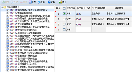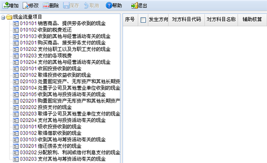 主要功能:通过建立对方科目与现金流量表项的对应关系,然后根据此对应关系在进行现金流量分配时自动指定,自动生成现金流量分录。