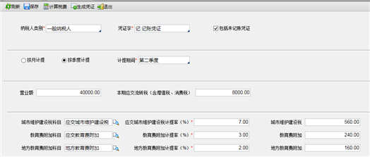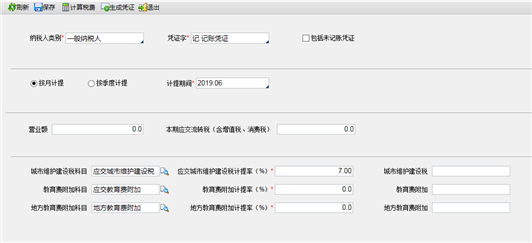 主要功能:系统自动从已做凭证中计算出所选期间的营业额、应交流转税,并根据企业信息中的纳税人类别显示附加税计提率,计算附加税,按照界面设置的入账科目生成凭证。