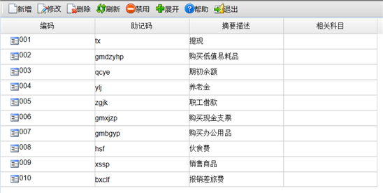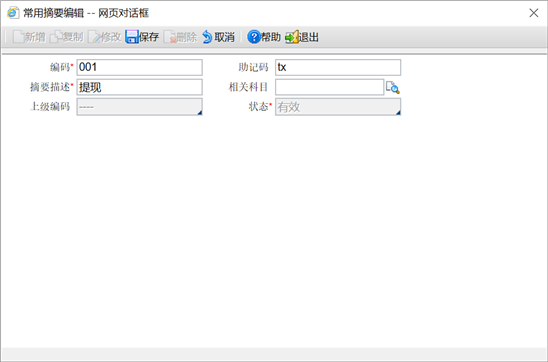 2.常用摘要中的“修改”只能修改“代码、助记码、摘要描述、相关科目”,使用状态只能通过常用摘要页面中的“禁用”按钮进行修改。