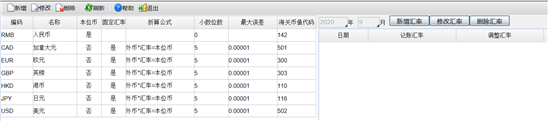系统预置了人民币、加拿大元、欧元、英镑、港币、日元、美元7种币种,如果用户需要使用其它币种进行核算,可以在此进行设置。如下图所示:
