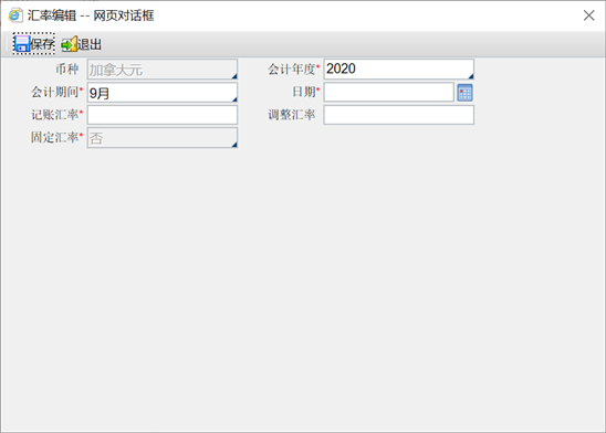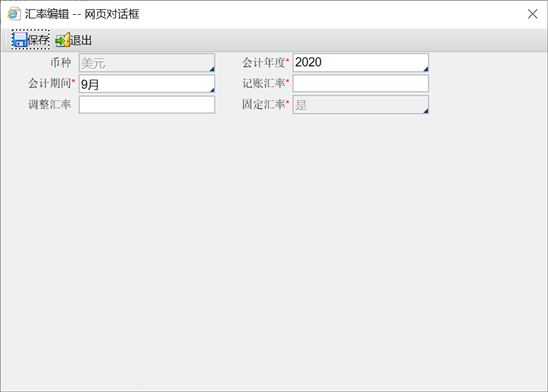 【第三步】修改汇率,并通过〖保存〗按钮进行保存。此处只能修改汇率“会计年度、会计期间、记账汇率、调整汇率”信息。