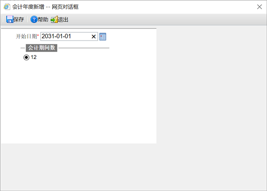 【* 步】在会计期间页面点击〖新增〗按钮,系统弹出会计年度新增窗口,如下图所示: