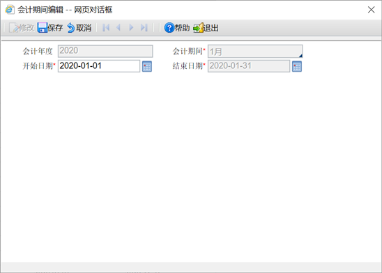 在会计期间页面选中要修改的会计期间,然后点击〖修改〗按钮可以对会计期间进行修改。只能修改会计期间的开始日期,已经使用过的会计期间不可修改。