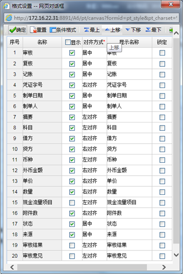 用户使用此功能可以自由设置凭证查询页面表体列名的显示,点击