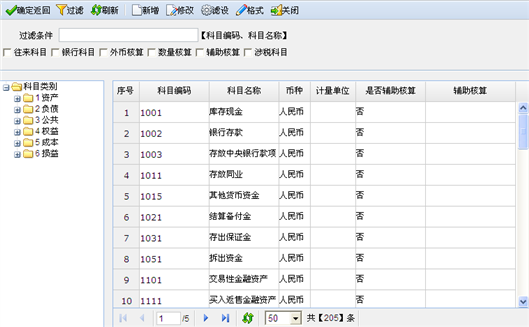 3) 由于科目所带辅助核算不同,余额所显示的表格亦不同,若科目带外币核算,则余额页面显示外币列,若科目带数量核算,则余额页面显示数量、单价列。