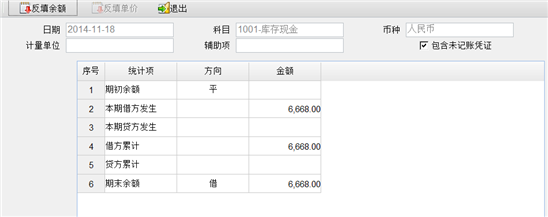 2、 余额按照科目方向显示,如科目方向是借方,科目余额在贷方,余额显示负数。