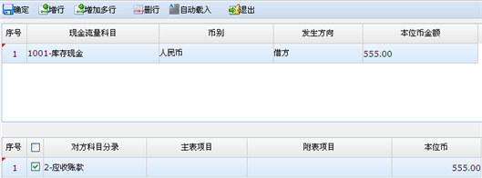 6) 现金流量本位币金额和凭证行本位币金额必须相等,可以只录入现金流量附表项目,现金流量主表项目可以为空。