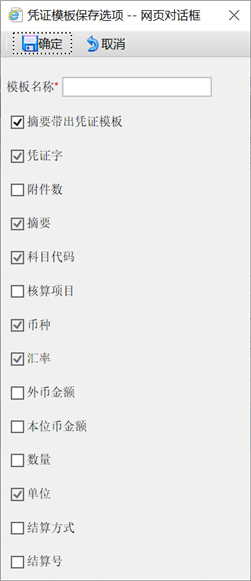 用户勾选需要保存的项目,录入模板名称,点击〖确定〗按钮,即可保存模板。凭证需保存后才可保存为凭证模板。