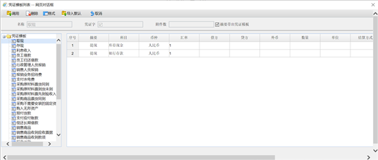 若想导入软件预置的凭证模板,可以点击〖导入默认〗,导入默认模板将覆盖现有预置模板,不会覆盖用户手工新增的模板。