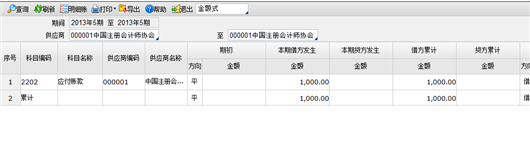 - 选择明细行,点击〖明细账〗按钮,可联查供应商往来明细账。
