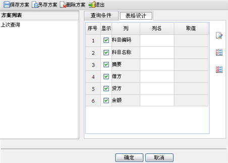 * 次进行账表查询时,系统自动将录入的查询条件保存为“上次查询”方案